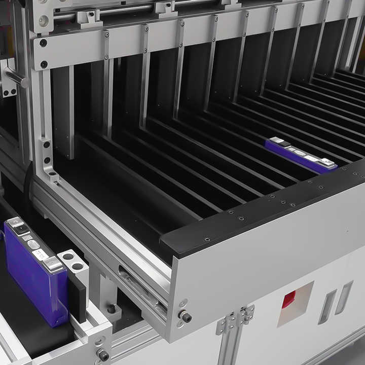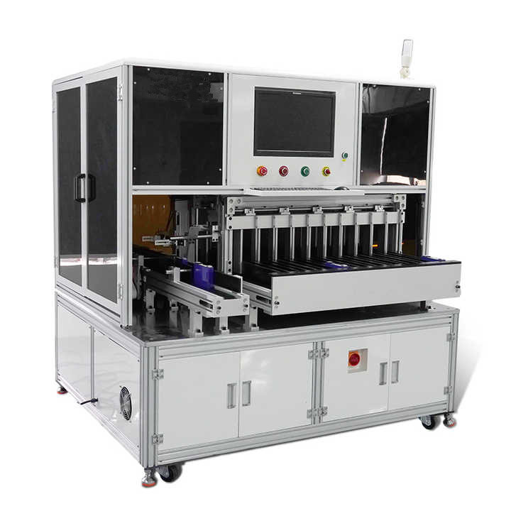 The ten channel prismatic battery sorting machine is an automatic sorting device suitable for square shell batteries. This device is compatible with multiple cell sorting options. The device achieves internal pressure and resistance testing of square shell cells through an internal resistance tester. The parameters of each cell are tested according to the upper computer software settings, and different levels of batteries are moved to different channels according to the judgment results, thus achieving automatic sorting of battery products (the device has a scanning data storage function). The equipment is composed of a feeding mechanism, a code scanning mechanism, a testing mechanism, an automatic sorting mechanism, etc. According to user requirements, the upper computer software is designed and developed. According to the group information, the battery cells are automatically sorted and collected into their corresponding feeders. The operation is simple, the sorting is accurate, and the efficiency is high.